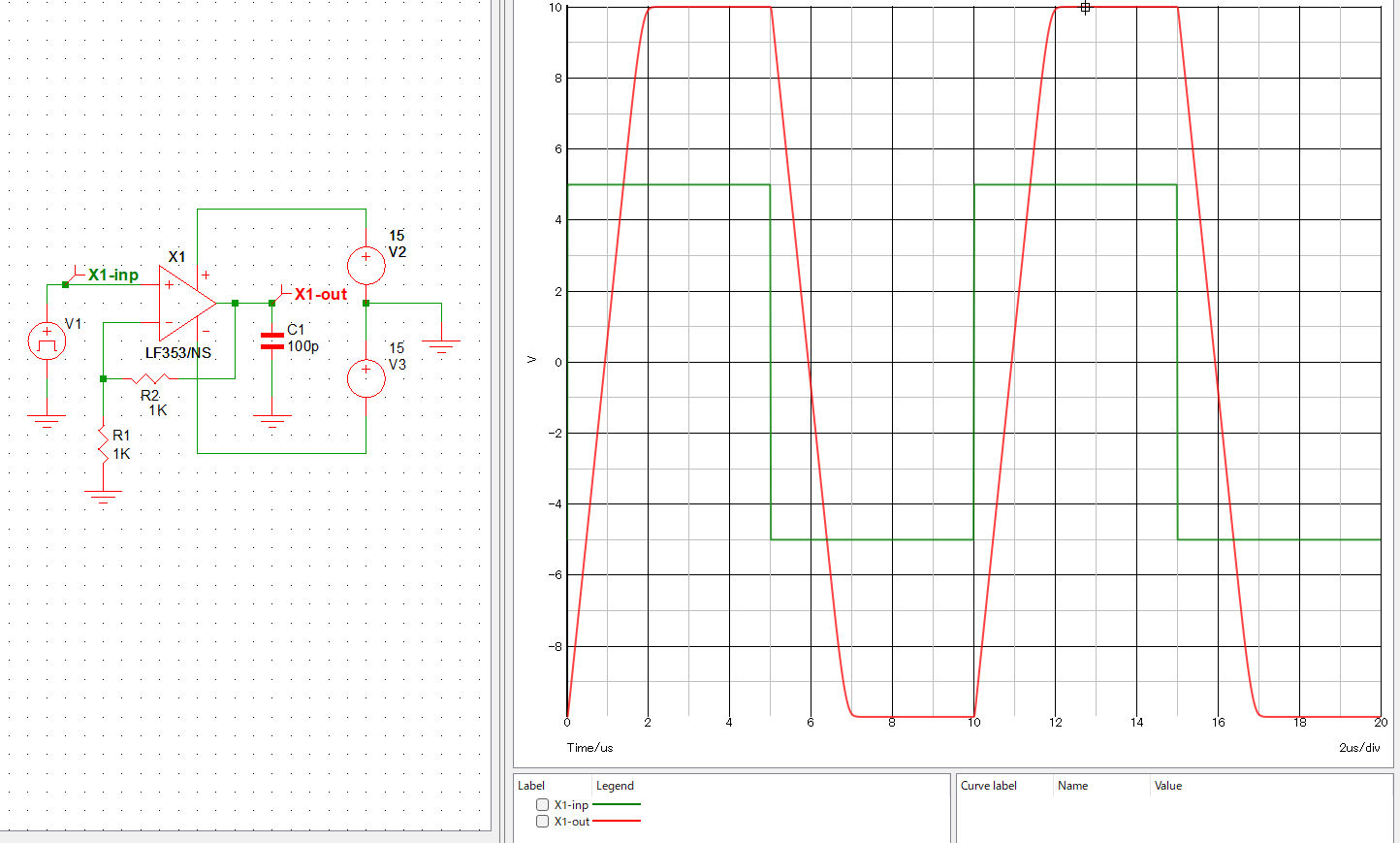 145ページの、5.3 OPアンプの方形波応答を調べる のところ。本の通りにやってみるとこうなった。