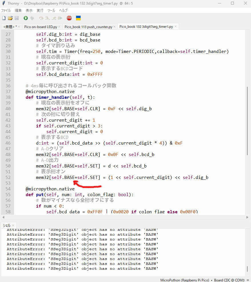 それを直して再実行しても・・・さらには一旦Thonnyを終了して立ち上げ直してやってみても、なぜかそのエラーの状況は変わらない。なんだこれ?こうなる理由は不明。