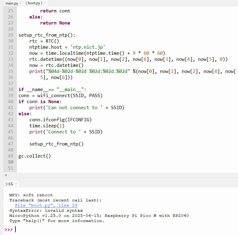 次は199ページ。boot.pyのコードを手入力して、それをPico Wに送る。ここの環境でのID/PASSも入れる。そして、シェル上でctrl+Dをすると、リセットがかかって再起動されるのだが・・・これ。