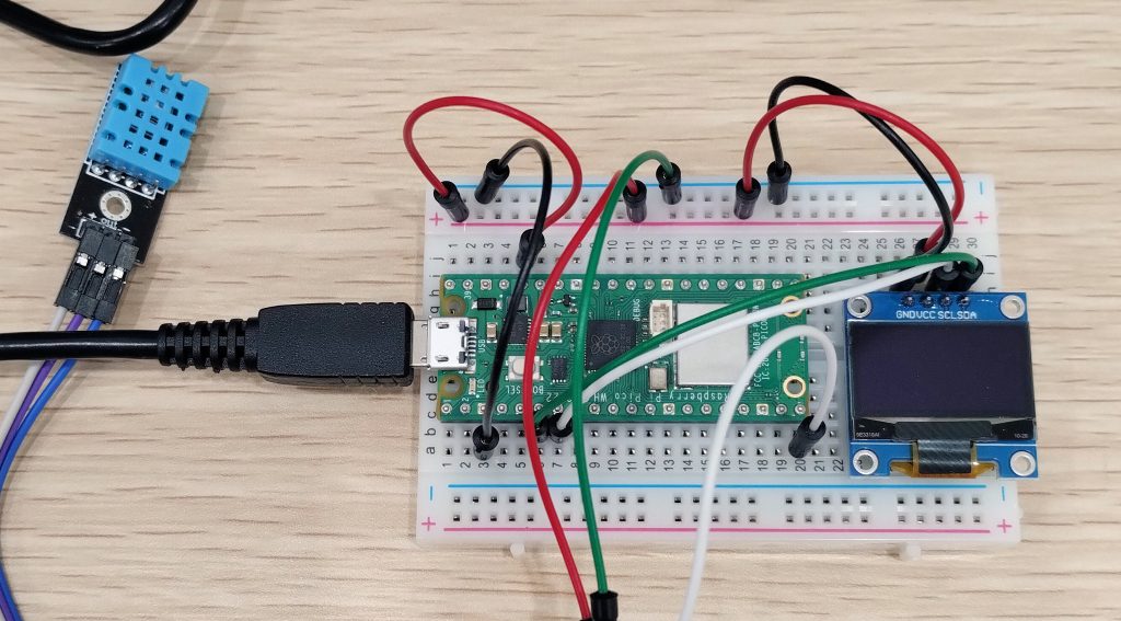 見ての通り、前回やったラズパイPicoの漢字表示温湿度計をそのまま流用。ラズパイPicoを抜いて、そこに、前から買ってあったラズパイPico WHを入れた。たまたまヘッダ付きのWHを1つだけ買ってあったので、面倒なので半田付けなしで入れられるこれを迷わず使用。(^^)/