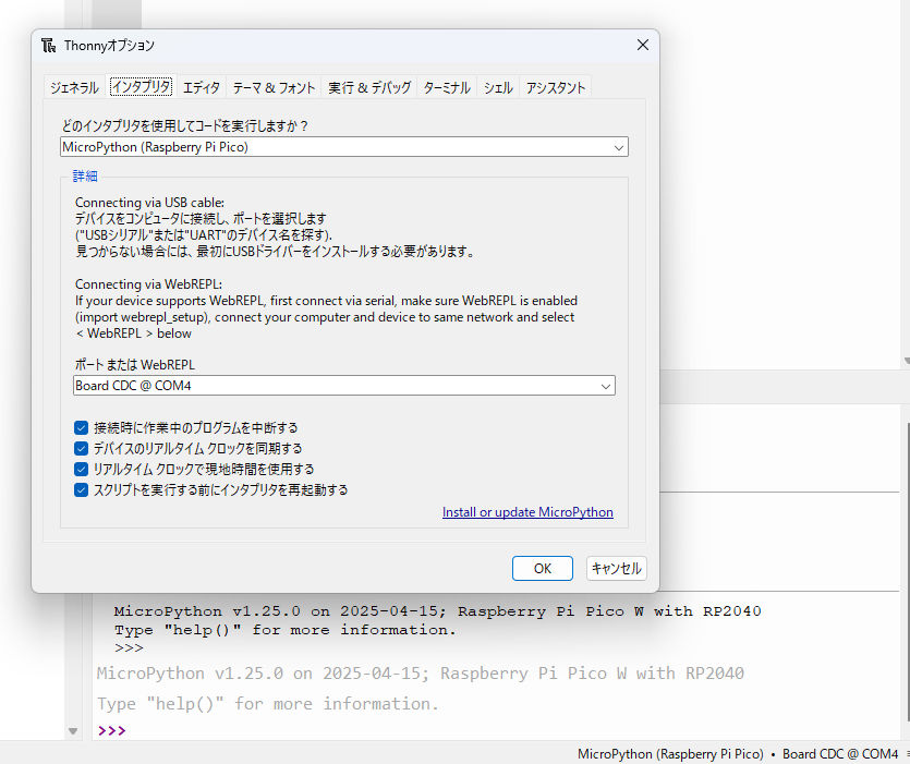 ここからPico W用のを頂いてくる。入れた後で、Thonnyのセッティング。今回はCOM4だった。