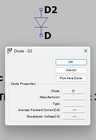 見ての通り、D1の値はDのままである。ここを変更しようと思っても、なぜか変更不可能になっている。なので、MyDiodeとして入れた数値は反映されていない。なのでここが変更できないと次に進めない。