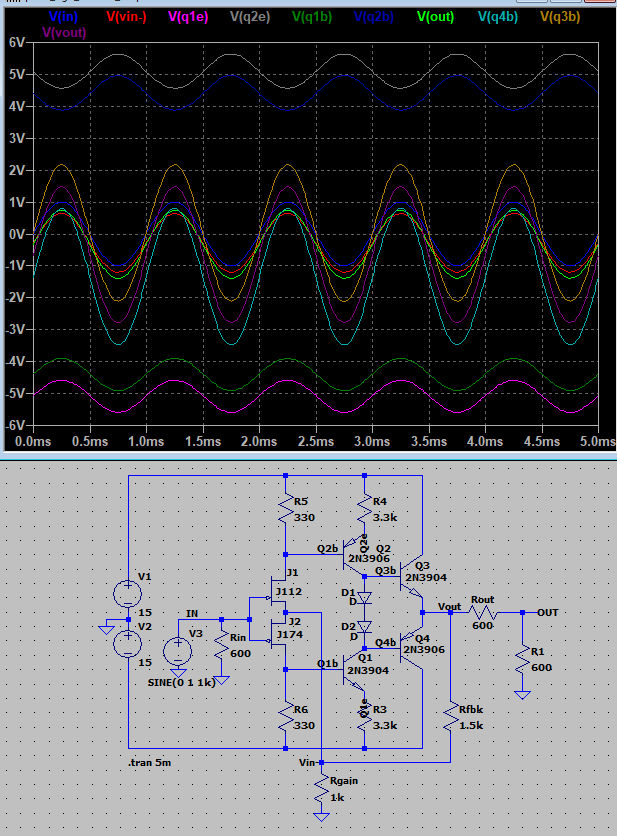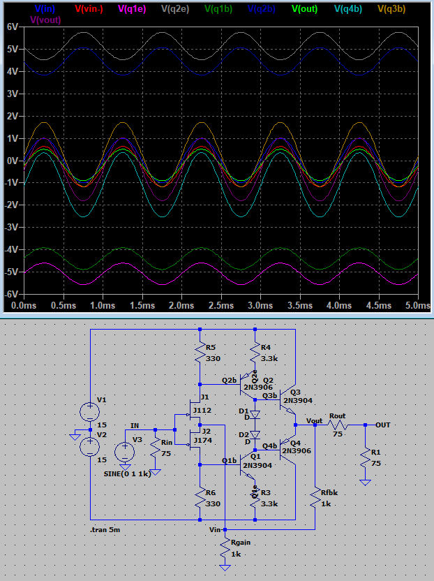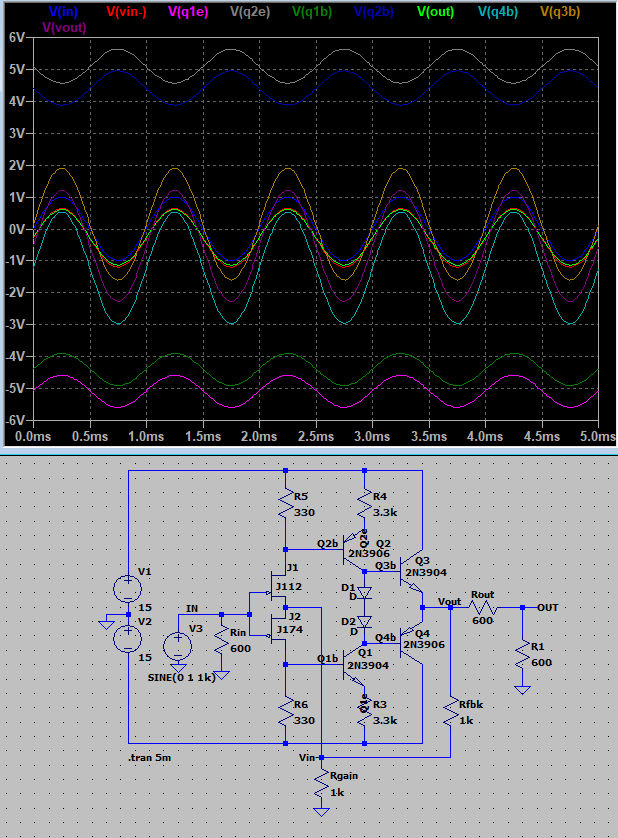 ほぼ同様に動いている。お次は、帰還抵抗を1.5倍にする。どうも入力レベルよりも出力レベルのほうが小さかったので、同じ振幅になるように微調整してみた。これ。