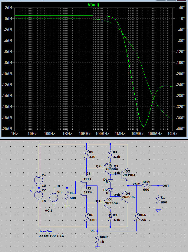 というわけで、167ページの図7をやってみる。電流帰還形増幅器に、入出力のインピーダンス・マッチング回路も含んだビデオ・アンプ。この例では75Ωの抵抗が入出力に入っているが、原理的に、ここの抵抗値をほかの値にすれば、50Ω系・300Ω・600Ω….その他任意のインピーダンスに対応したアンプが作れる(但し集中定数回路として)ことになる。まずは、これ。