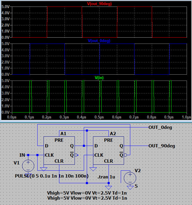 というわけで、CLKを4分周した周波数の、90度位相がずれたDuty比50の2つのクロックが得られた。これで第3章が終了した。